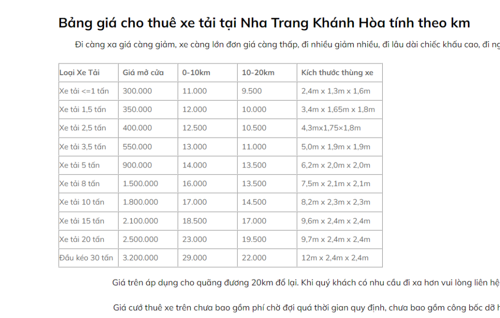 Bảng giá cước thuê xe tải tại Nha Trang Khánh Hòa